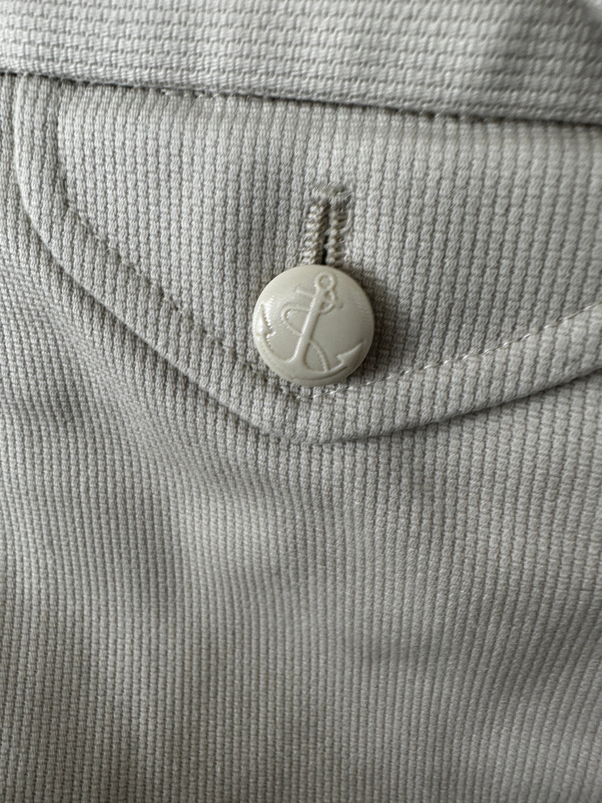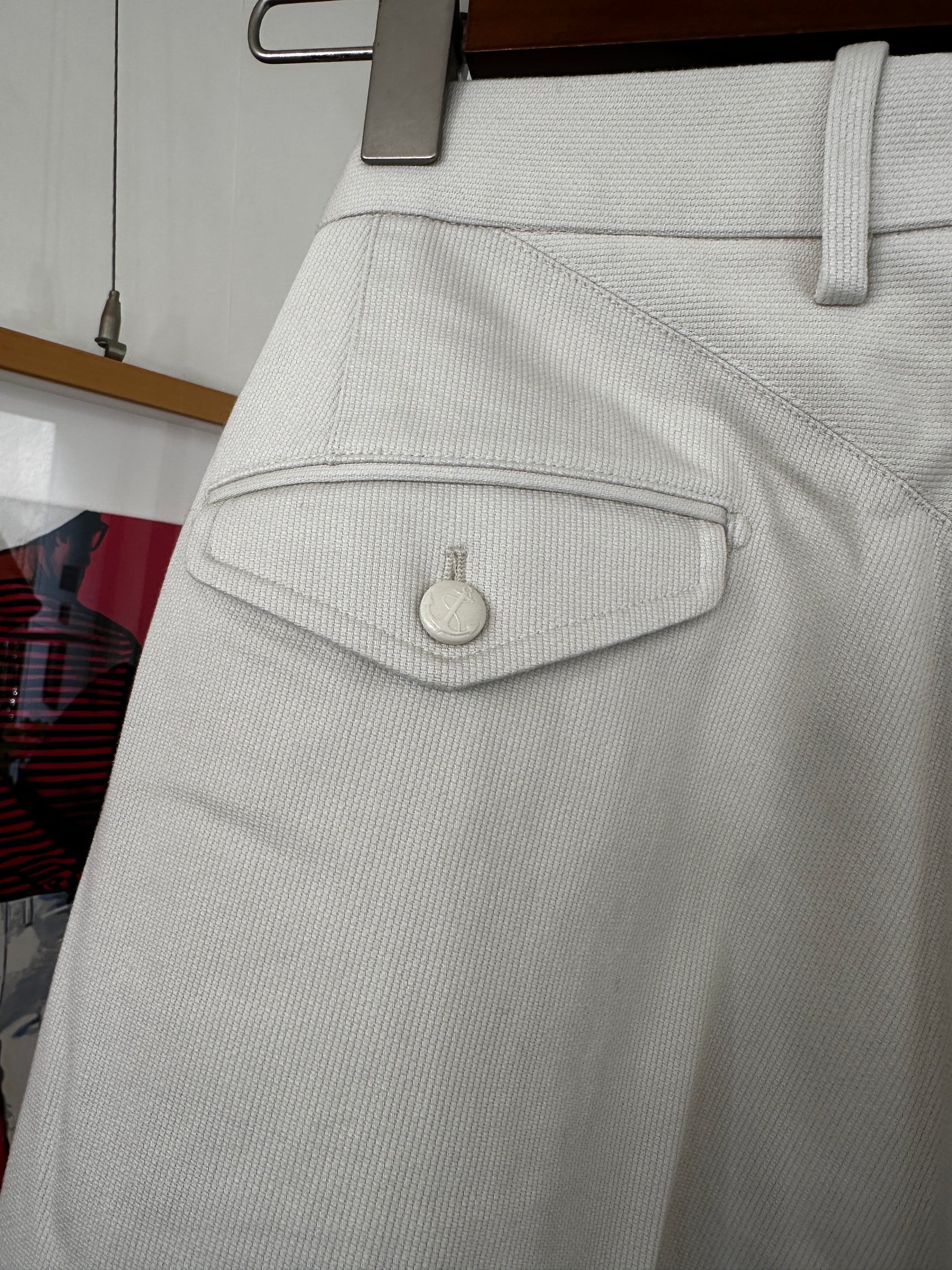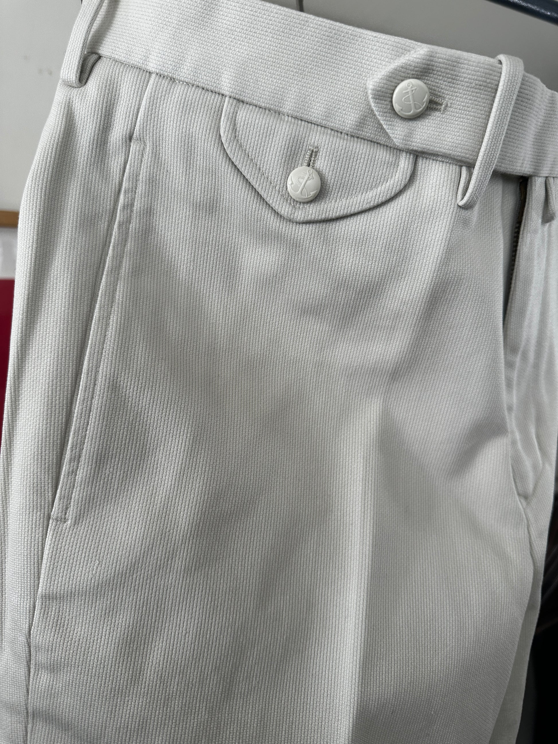丈夫で通気性の良いコットン生地で独特な凸凹と風合いが特徴のピケを採用。シルエットはノープリーツ一番太いシルエット。ウォッチポケットやフロント持ち出しの白いアンカーボタンが、古き良き時代を見せてくれます。